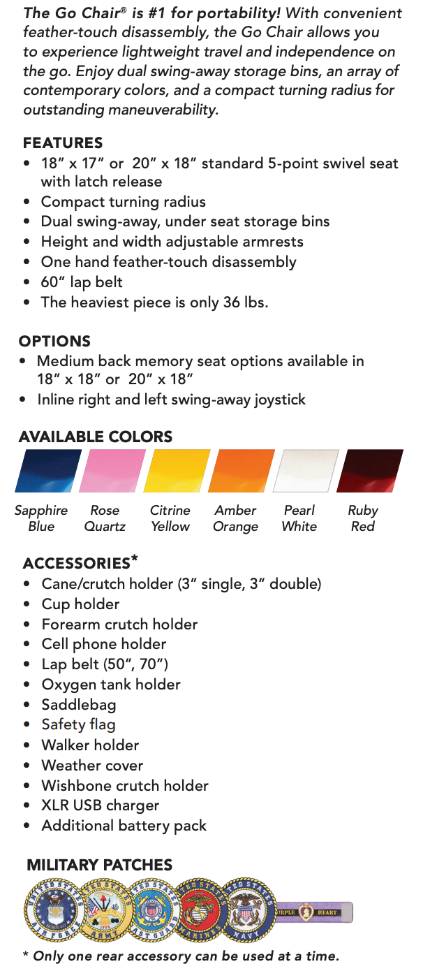 - 18" x 17" or 20" x 18", 5-point swivel seat with latch release
