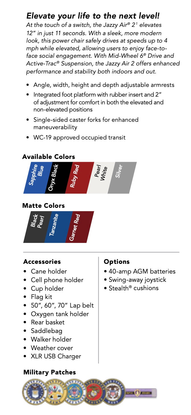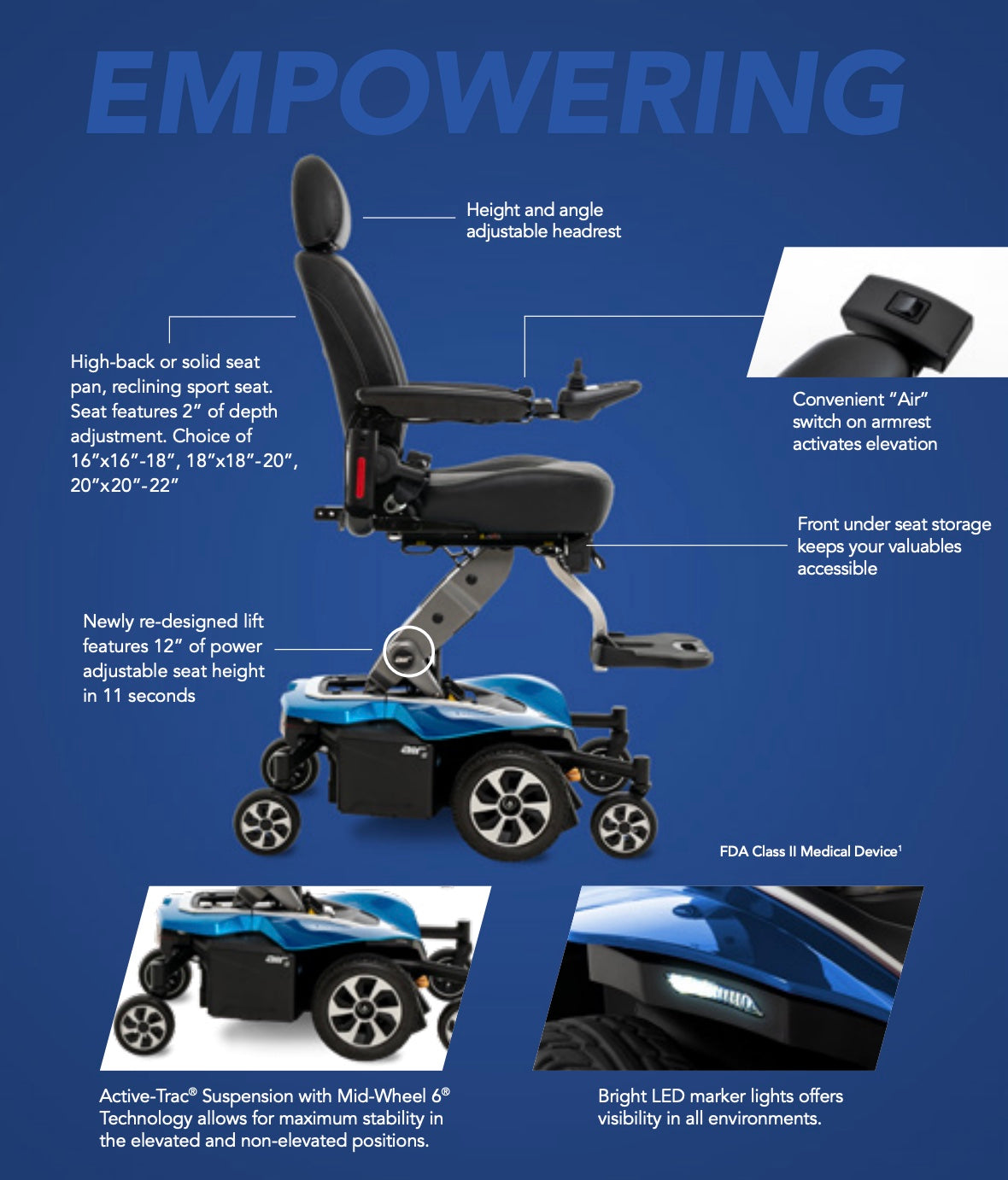 • Newly re-designed lift features 2" lower seat-to-floor height, enabling user to sit comfortably at standard table or desk, raises and lowers by using the Air switch or VR2 joystick