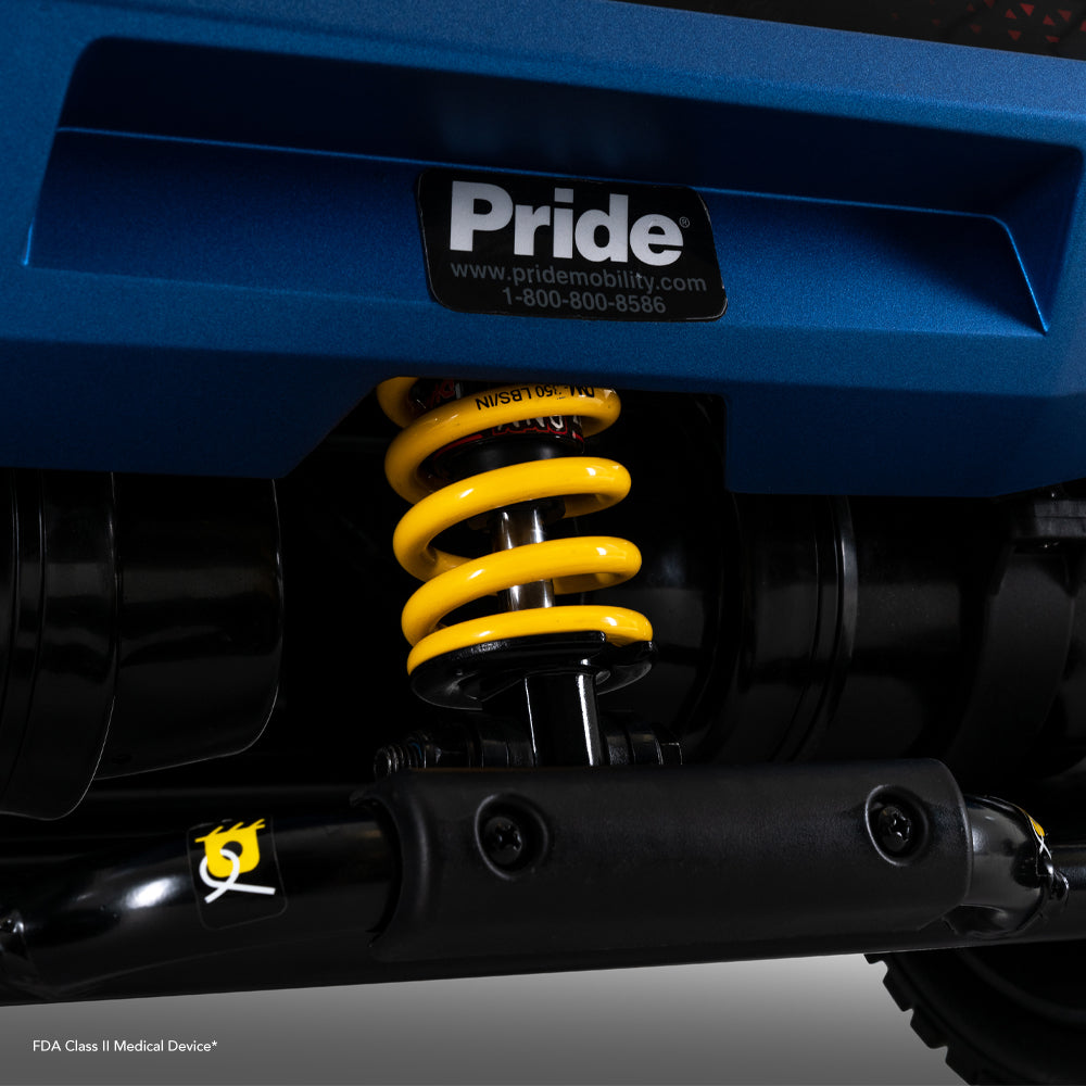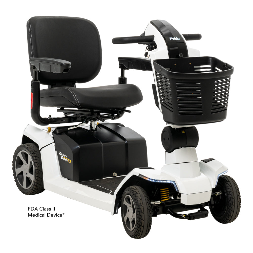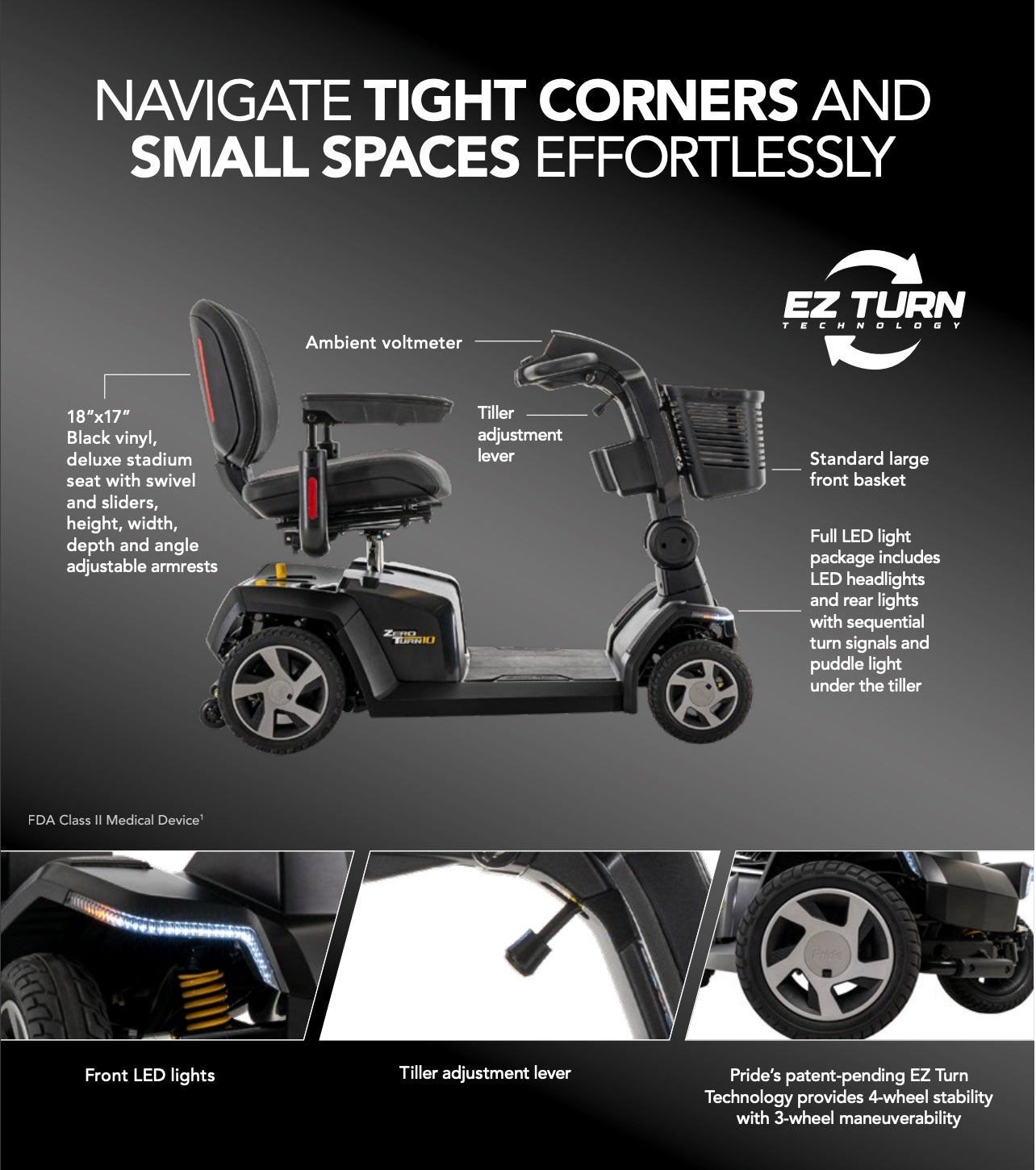- Pride’s patent pending, intelligent-turning, iTurn Technology provides 4-wheel stability with 3-wheel maneuverability